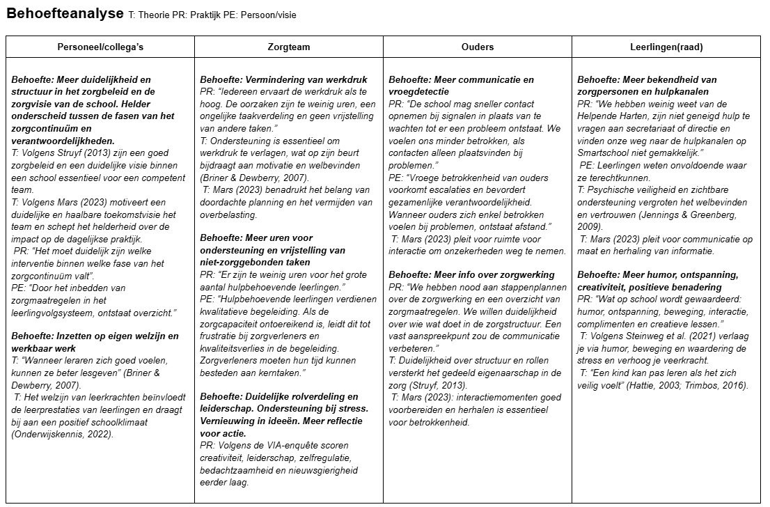 Uit de behoefteanalyse komt een nood aan een structureel zorgbeleid binnen de school naar voren. Zowel personeel, zorgteam, ouders als leerlingen verlangen naar duidelijkheid, communicatie en betrokkenheid. Uit de signalering blijkt ook dat de schoolvisie verouderd is. Het is onduidelijk of de kernwaarden nog worden nageleefd en hoe deze vorm krijgen in de praktijk. Leerkrachten geven aan onzekerheid te ervaren over wat er van hen verwacht wordt binnen zorg omdat de taakverdeling onduidelijk is. Dit wordt bevestigd in de praktijk: "Het moet duidelijk zijn welke interventie binnen welke fase van het zorgcontinuüm valt." Ook ouders en leerlingen benoemen het gebrek aan overzicht en communicatie over de zorgwerking. Ze vragen naar duidelijke stappenplannen en aanspreekpunten. Ouders vragen om sneller betrokken te worden en leerlingen geven aan onvoldoende zicht te hebben op de hulpkanalen.