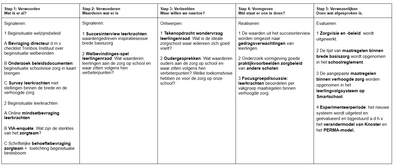 Wat ik meeneem van Lammers et al. (2019) en Mathyssen & Gevaert (2022) is de methode van Appreciative Inquiry die uitgaat van wat werkt. Op het gebied van transparantie zorgt de aanpak met duidelijke stappen en methoden voor helderheid. Mijn plan is positief psychologisch geïnspireerd gebaseerd op Seligmans (2012) werk over welbevinden. Dit wil ik bereiken door de nadruk leggen op krachten en expertise binnen de school. Dit doe ik met de VIA-enquête over de sterktes van het zorgteam in stap 1, het benoemen van succeservaringen van leerkrachten en het ontdekken waarom leerlingen graag naar school komen d.m.v. het Welbevindinges-spel in stap 2 en het benoemen van krachten van de zorg op school tijdens de oudergesprekken in stap 3.