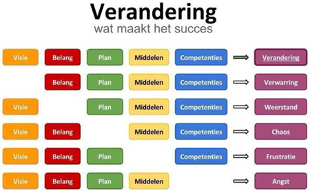 Figuur 11. De vijf elementen van het verandermodel van Knoster. Overgenomen uit Vijf elementen voor succesvol veranderen binnen het onderwijs van Wij-leren, 2024 (https://wij-leren.nl/veranderproces-elementen-knoster-sinek.php). Copyright 2024, Wij-leren.